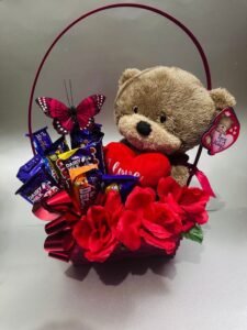 Sweet hampers with chocolates, mugs, soft toys, and personal messages.